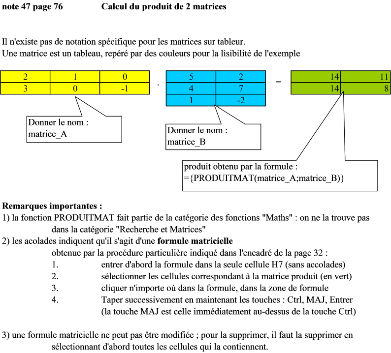 note 46 page 75 : opérations sur les matrices note 47 page 76 : produit de matrices sur tableur note 49 page 78 : compléments sur les déterminants