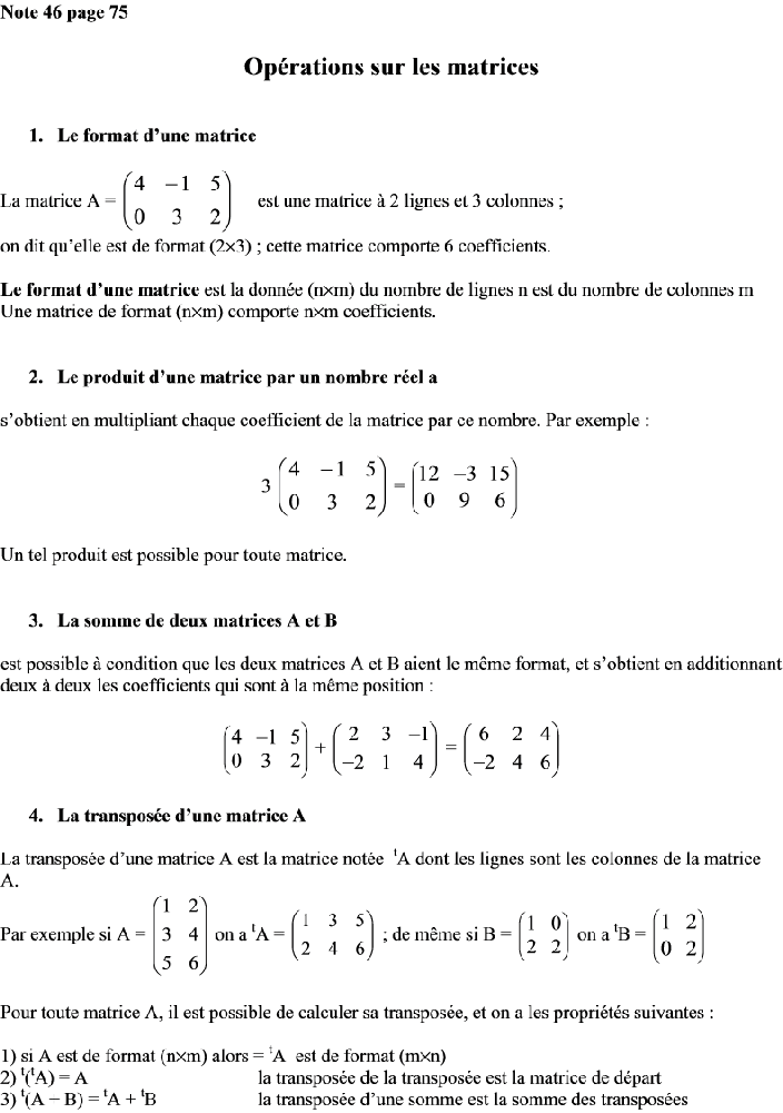 note 46 page 75 : opérations sur les matrices note 47 page 76 : produit de matrices sur tableur note 49 page 78 : compléments sur les déterminants